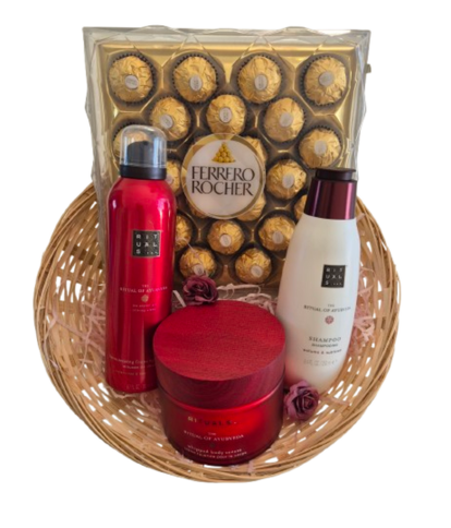 Ontdek dit luxe Rituals cadeaupakket met Ferrero Rocher chocolade, shampoo, douche foam en bodylotion. De perfecte wellness giftset voor iedereen die houdt van ontspanning en verzorging. Dit complete Rituals verwenpakket combineert premium huidverzorging met een heerlijke zoete traktatie, ideaal als cadeau voor haar, cadeau voor hem, verjaardag, moederdag of als relatiegeschenk.