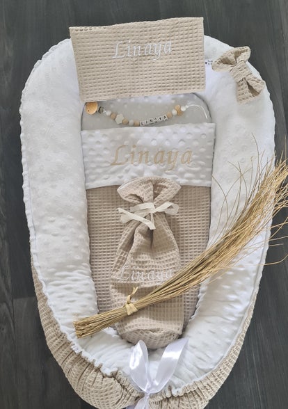 Op zoek naar een stijlvol en praktisch kraamcadeau? Deze prachtige set in de zachte kleur beige is ideaal voor elke kersverse ouder. Het bevat alles wat je nodig hebt om het je kleintje comfortabel te maken: