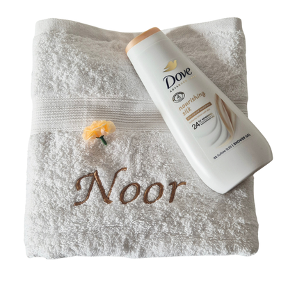 Geef je badkamer een persoonlijke touch of verras iemand met een uniek cadeau! Onze luxe witte handdoek is gemaakt van 100% zacht katoen en wordt professioneel geborduurd met een naam naar keuze. Ideaal voor dagelijks gebruik, sport, sauna of als persoonlijk geschenk bij een bruiloft, verjaardag of geboorte.