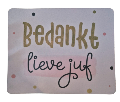 Verras de juf met een persoonlijk en praktisch cadeau! Deze muismat met een lieve boodschap is perfect voor op haar bureau. Ideaal voor de laatste schooldag, juffendag of als bedankje.