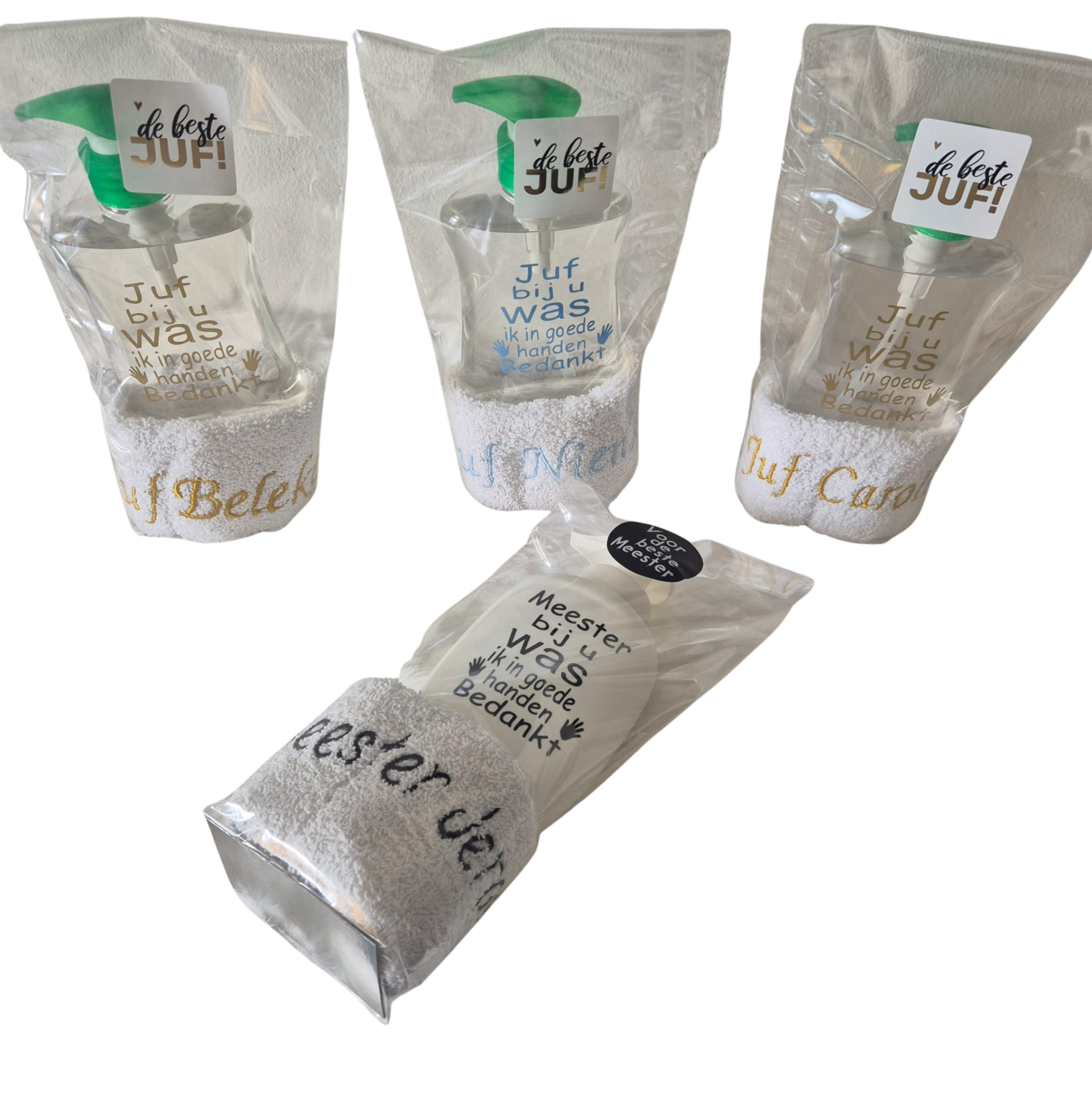 Zeepflacon met de tekst `Juf bij u WAS ik in goede handen Bedankt