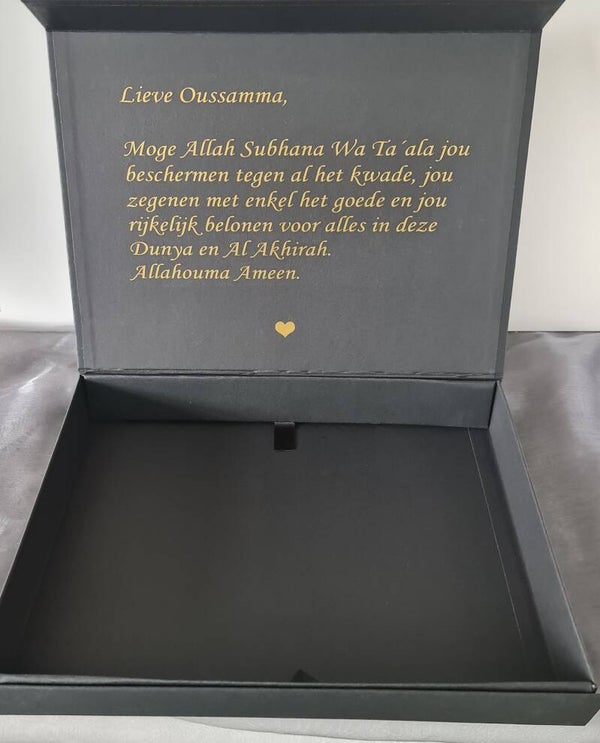 Bij ons vind je de ideale doos om jouw cadeau in te presenteren. Verkrijgbaar in drie stijlvolle kleuren: wit, zwart en goud. Of je nu een elegant, modern of feestelijk accent wilt toevoegen, wij hebben de doos die bij jouw geschenk past. Maak het extra bijzonder door een persoonlijke tekst toe te voegen en jouw cadeau krijgt een unieke, persoonlijke touch.