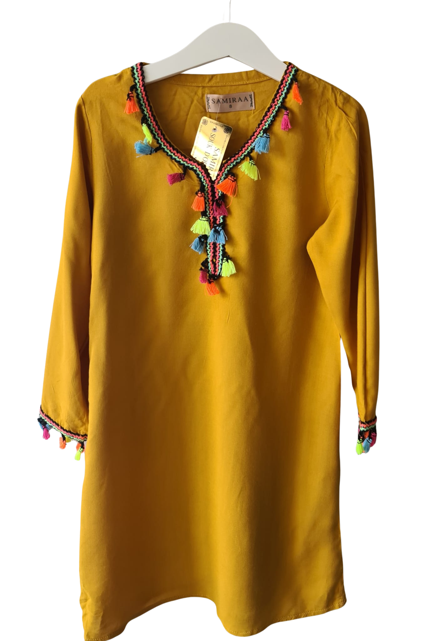 Okergeel Kinderjurkje met Franjes – ± 8 jaar