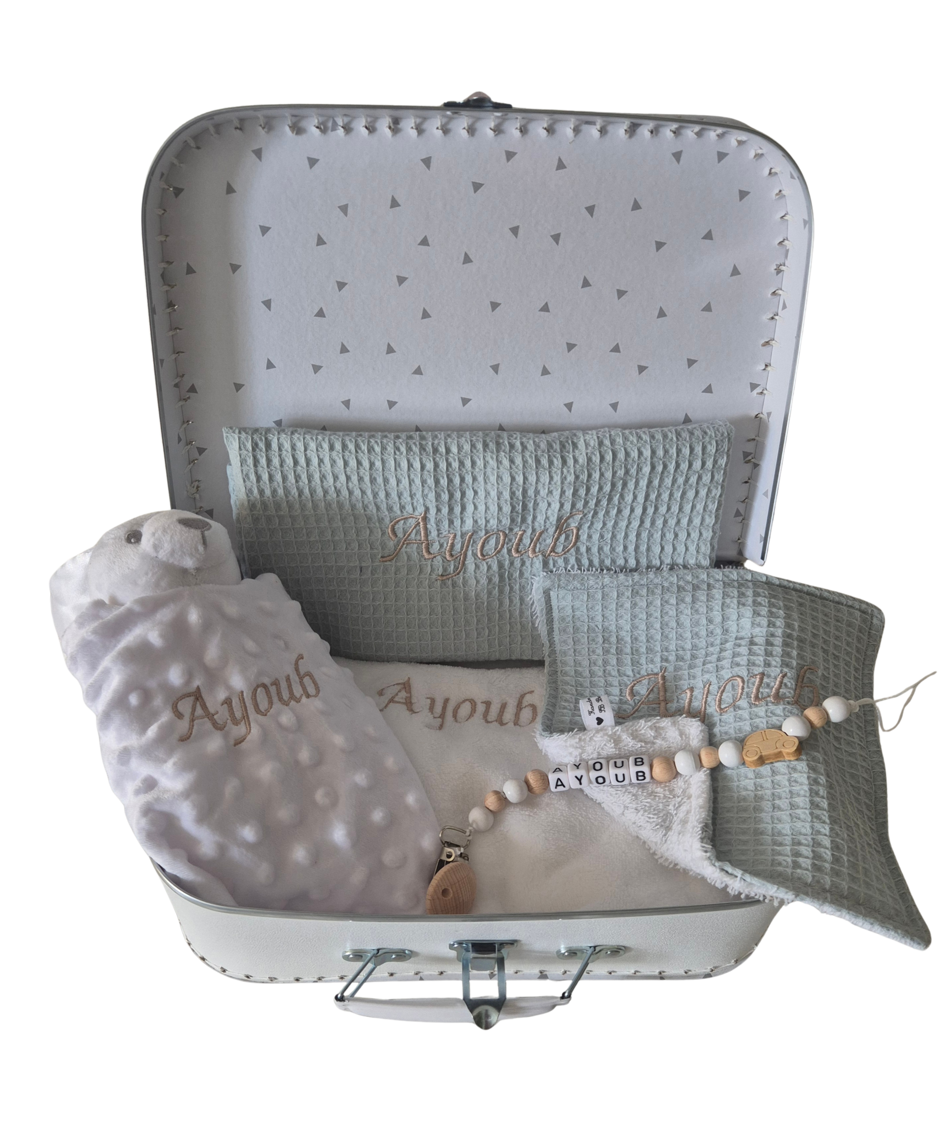 ✨ Gepersonaliseerd met naam – Uniek en persoonlijk! De naam van de baby op het koffertje of op één van de items maakt het cadeau extra speciaal.